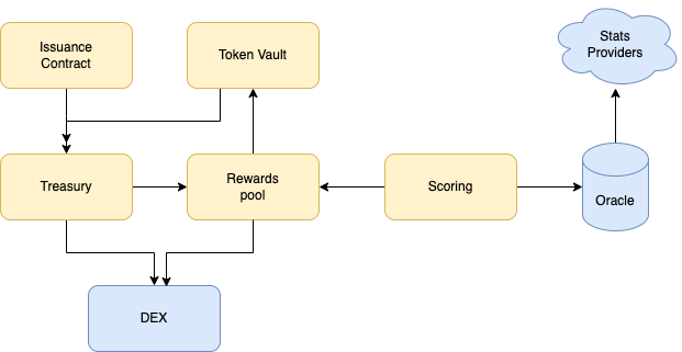 The rewards pool is a contract used to pay payouts to staked tokens in the vault. It is funded from the treasury, the player vault fees and the liquidity provision fees paid by the DEX.